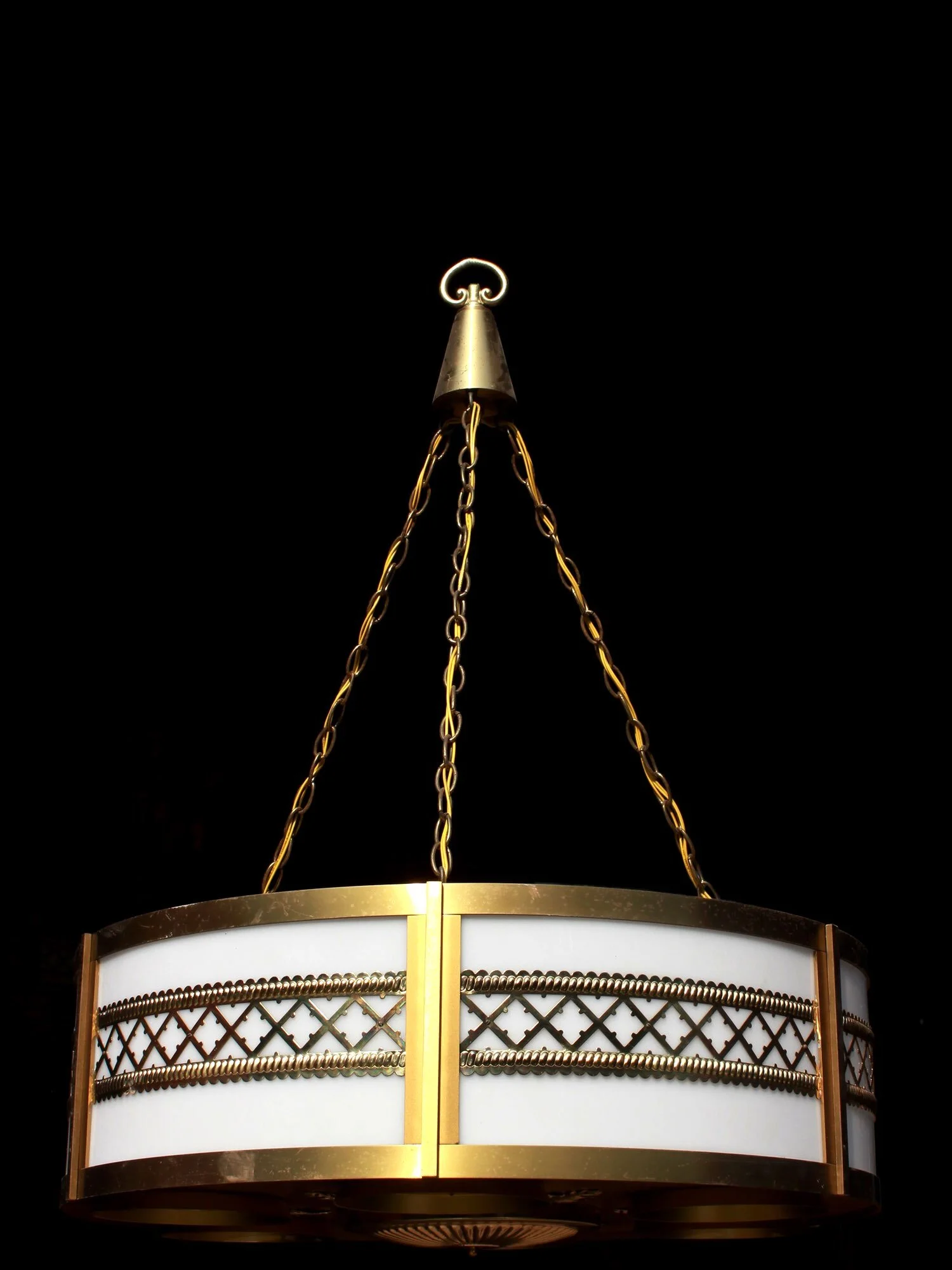 Elegant, round, antique light fixtures that are made of durable metal and have been plated in brass for a sophisticated look and feel. Delicate diamond patterns bordered by twisted rope sections line the entire fixture in a clockwise formation. Located underneath the fixture are multiple gorgeous, vented diffusers that protect the eyes of whomever may look up directly at the light. Combined between the 4 different sizes, 14 of these particular fixtures are still available.